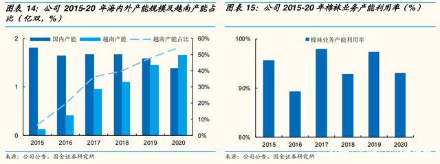 公司近年来加速越南工厂的发展,越南基地的棉袜产能提升至 2020 年的 1.65 亿双,同比增长 13.80%,产能占比从 2019 年的 49%上升至 55%。