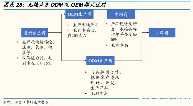 棉袜的生产销售一般涉及到原料供应商、OEM 生产商、采购中间商和品牌商 4 个环节,传统袜厂按照采购商的要求进行生产,往往不参与设计研发;而公司则不断精进自身研发技术,转型成为以 ODM 为主的生产模式,贯通产业链优势。