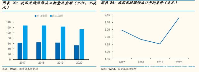 根据海关总署统计,2020年我国无缝服饰出口 53.3 亿件、受到疫情影响同比下降 15.2%,出口金额为 113 亿美元、同比下降 8.2%,平均单价同比提升 9.2%。目前我国是全球第一大无缝服饰出口国,产量占全球的 60%以上。