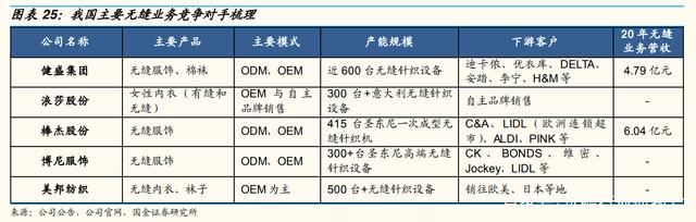 目前无缝行业竞争充分、行业高度分散化,其中大部分企业的规模较小、设备数量在 100 台以下,主要提供 OEM 代工服务;高端市场竞争者较少,其中健盛集团、棒杰股份积极从 OEM 向 ODM 转型,自身研发设计实力不断提高,差异化竞争优势显著。