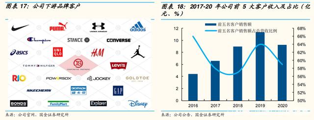 公司的棉袜业务经长期积累,目前与众多国际优质运动、休闲服饰品牌建立长期合作,其中核心客户 Puma、UA、太平鸟、阿迪达斯、优衣库均保持 30%以上的订单增速,2017-20 年公司前 5 大客户收入占比稳定在 55%-65%之间,大型客户对订单的品质、创新能力、按期交货方面要求较高,不会轻易更换供货商,保证了公司经营稳固。