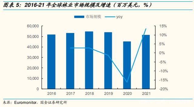 2021年随着全球经济复苏、消费者生活回归常态化,对袜子这类刚需品的需求显著回升,袜业规模为 511.84 亿美元、同比增长 13.50%,基本回归到疫情前水平。