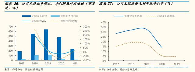 1H21 该业务在订单拉动下缓慢恢复,实现营收 2.35 亿元、同比增 18.6%、同比于 19 年降 17.5%;净利润 1068 万元、同比增 11.5%。由于无缝业务具备一定科技属性,对应毛利率水平相对更高, 19 年该业务毛利率达到 32.79%;受到疫情因素影响,20 年毛利率仅为 14.27%。