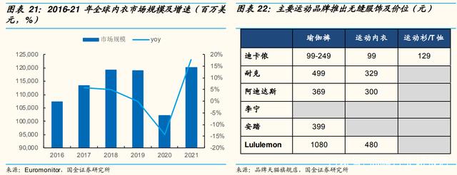 根据 Euromonitor,2021年全球内衣市场规模1201.93亿美元,年复合增速2.28%;若按照Zion Market Research无缝内衣占比20%进行推算,无缝内衣市场空间在240.39亿美元。