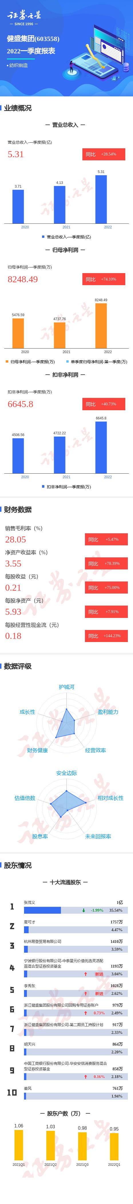 健盛集团2022一季报显示,公司主营收入5.32亿元,同比上升28.54%;归母净利润8248.49万元,同比上升74.1%;扣非净利润6645.8万元,同比上升40.73%;其中2022年第一季度,公司单季度主营收入5.32亿元,同比上升28.54%;单季度归母净利润8248.49万元,同比上升74.1%;单季度扣非净利润6645.8万元,同比上升40.73%;负债率41.45%,投资收益368.76万元,财务费用896.14万元,毛利率28.05%。