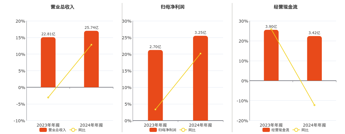 公司营业总收入为25.74亿元。归母净利润为3.25亿元。经营活动现金净流入为3.42亿元,较去年同报告期经营活动现金净流入减少4794.83万元,同比较去年同期下降12.29%。