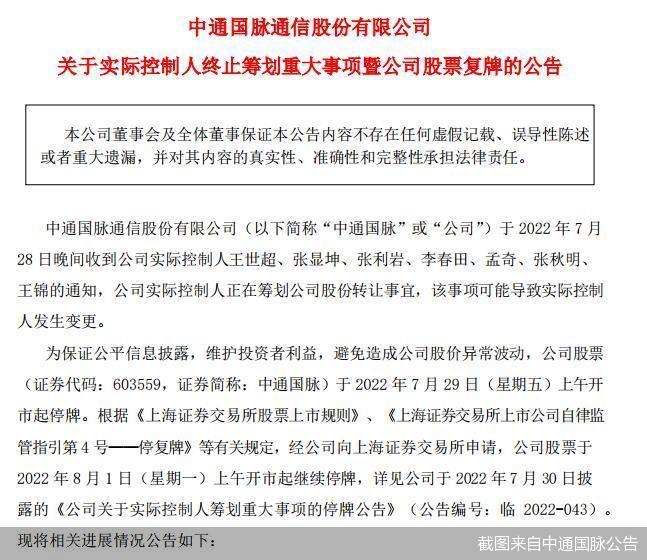 7月29日,中通国脉曾披露公告称,公司于2022年7月28日晚间收到公司实际控制人王世超等人的通知,公司实控人正在筹划公司股份转让事宜,该事项可能导致实控人发生变更。