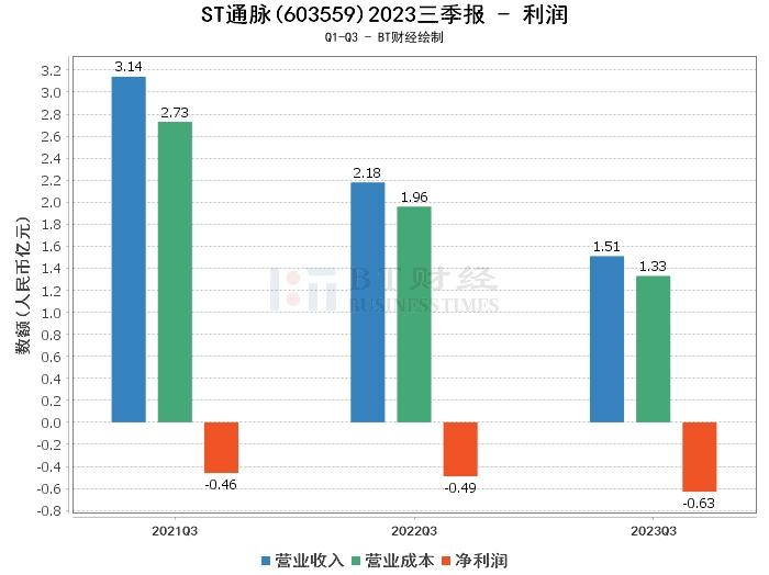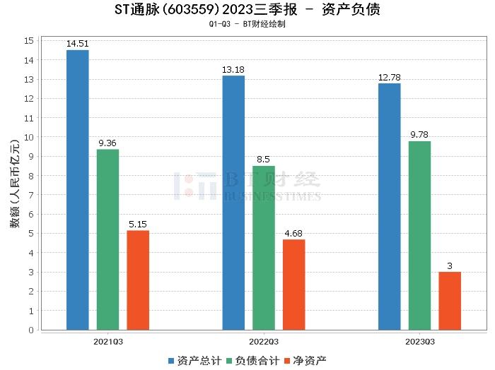 从资产负债方面来看,ST通脉公司2023年三季度末的总资产为12.78亿元,相比上年度末的12.44亿元有所增加。负债合计为9.78亿元,较上年度末的8.82亿元有所上升。公司的净资产为3亿元,相比上年度末的3.62亿元有所减少。资产负债率为76.54%,较上年度末的70.89%有所增加。