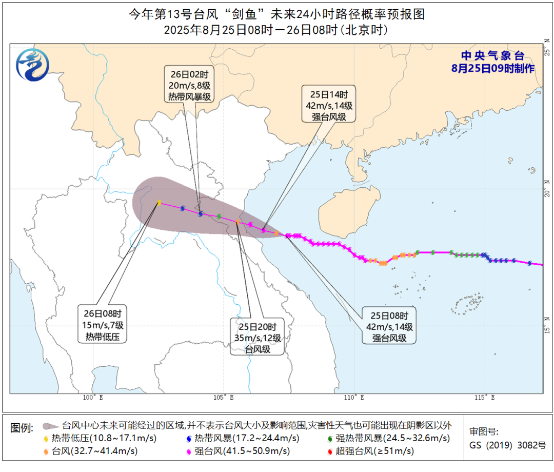 据中央气象台最新消息,今年第13号台风“剑鱼”(强台风级)的中心今天(25日)上午8点钟位于越南荣市偏东方向约185公里的北部湾南部海面上,就是北纬18.3度、东经107.4度,中心附近最大风力有14级(42米/秒),中心最低气压为955百帕,七级风圈半径200-360公里,十级风圈半径100-120公里,十二级风圈半径50-60公里。
