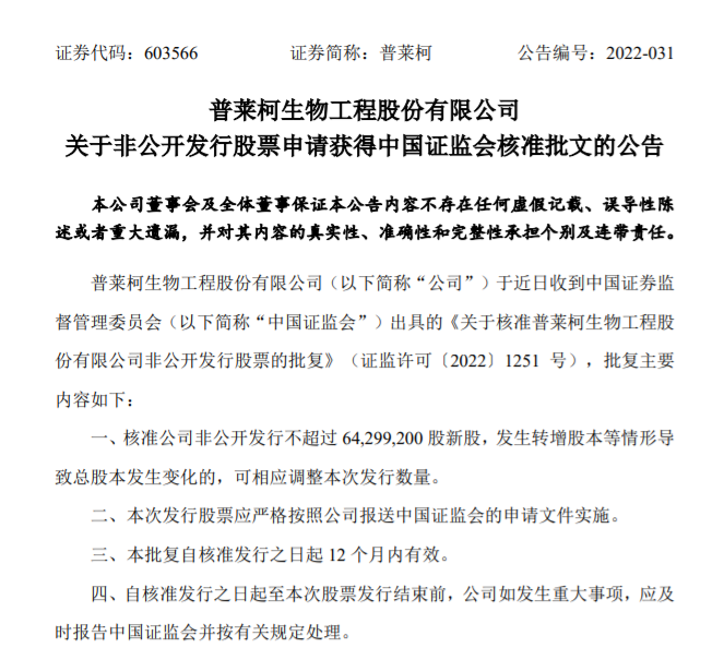 2022年6月末,普莱柯发布:关于非公开发行股票申请获得中国证监会核准批文的公告。该公告称,项目募集资金总额不超过8.98亿元。股票数量不超过64,299,200股,不超过本次发行前公司总股本的20%。