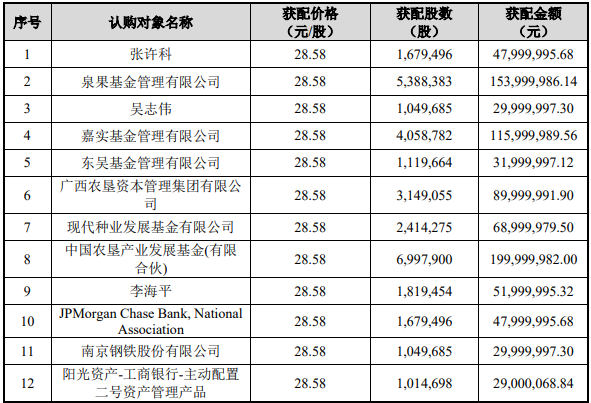 普莱柯9月9日公布2021年非公开发行A股股票发行情况报告书,此次非公开发行股票的发行价格为28.58元/股。此次非公开发行最终募集资金规模约为8.98亿元,发行股数为3142.0573万股。其中,中国农垦产业发展基金获配金额约2亿元,泉果基金、嘉实基金、JPMorgan等参投。