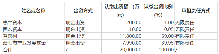 基金总规模2亿元,其中普莱柯认缴出资1.18亿元,占比59%;洛阳市产业发展基金认缴出资7990万元,占比39.95%。