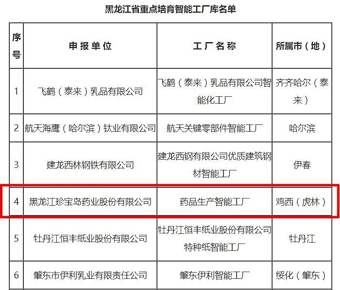 日前,2021年黑龙江省智能工厂及重点培育库名单揭晓,珍宝岛药业作为黑龙江省智能制造前沿企业,被纳入黑龙江省重点培育智能工厂库。