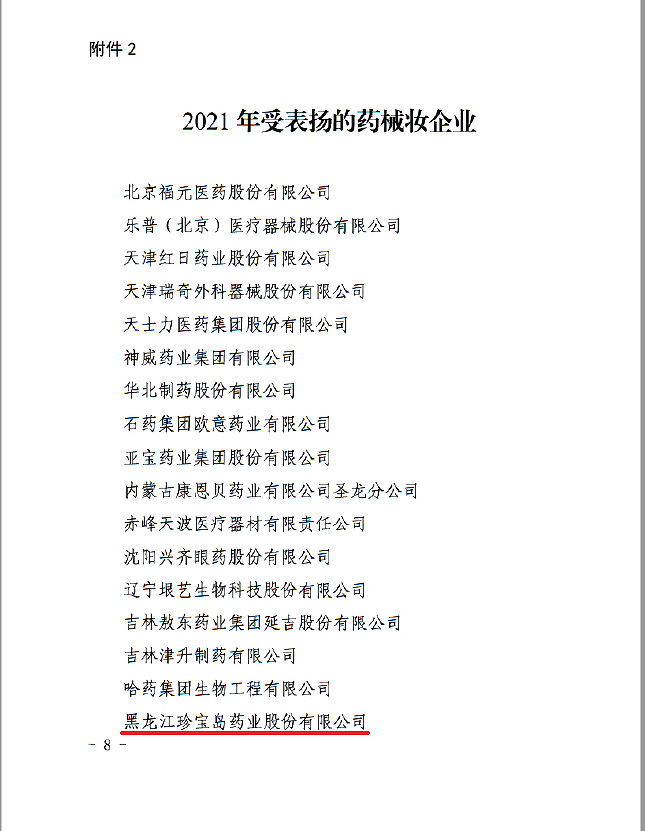 经黑龙江省药品不良反应监测机构在全省制药企业范围内遴选、综合评估,推荐至国家药品不良反应监测中心综合评定,最终认定黑龙江珍宝岛药业股份有限公司等67家药械妆企业在履行药物警戒主体责任方面表现突出,予以表扬。