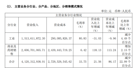 珍宝岛业务主要涵盖医药工业、医药商业、中药产业等。从营收构成看,2021年度,商业及药材销售是其业绩“顶流”,实现营收26.07亿元,同比增长118.13%。而医药工业领域有所下滑,仅实现15.14亿元营收。