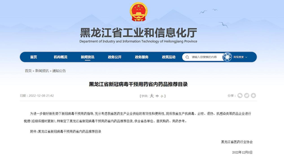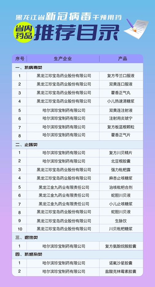 12月8日,《黑龙江省新冠病毒干预用药省内药品推荐目录》正式发布。珍宝岛药业及子公司多款产品被纳入推荐目录。