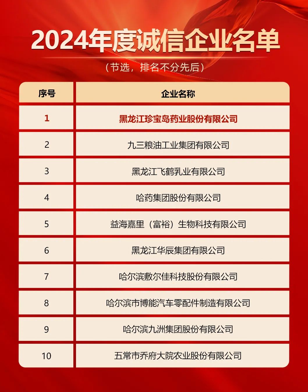12月26日,黑龙江省诚信建设促进会成立20周年庆祝大会在哈尔滨市隆重举行,并同期揭晓了黑龙江省2024年度诚信企业榜单。珍宝岛药业凭借诚信工作建设成果,荣获黑龙江省2024年度诚信企业,企业ESG价值受进一步认可及提升。