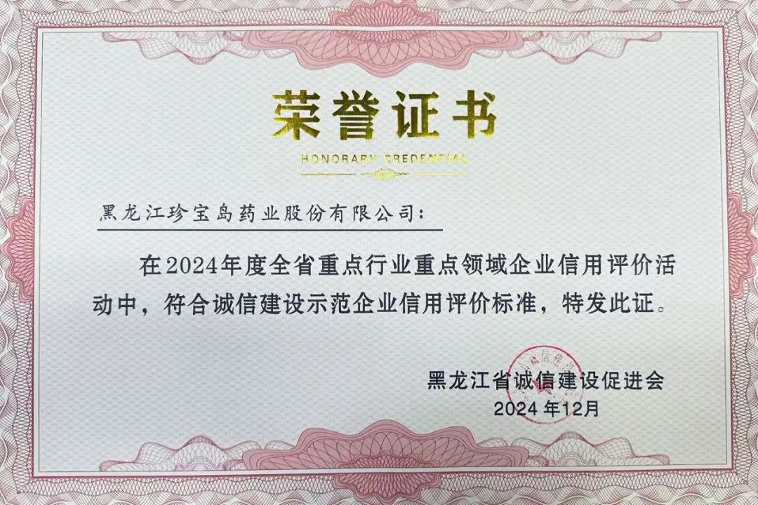 珍宝岛药业荣获黑龙江省2024年度诚信企业,是黑龙江省诚信建设的权威组织对珍宝岛药业多年来持续打造知名诚信品牌,诚信经营不断取得成果的高度肯定及认可。近年来,珍宝岛药业将诚信建设与诚信品牌打造提升至企业战略高度,结合行业特点及企业经营实际情况,积极开展诚信品牌建设活动,积极打造以“质量诚信,守法自律”为核心的经营体系。