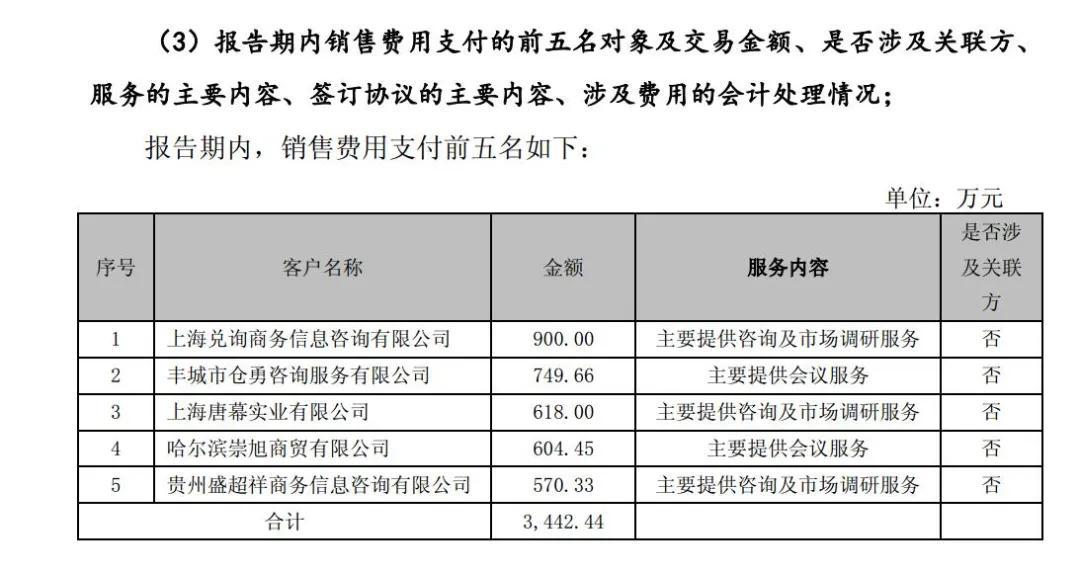 其中,上海兑询商务信息咨询有限公司的发生总金额也不过900万元。这表明,珍宝岛的销售费用支付对象十分分散。