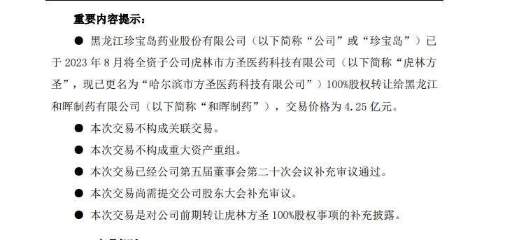 2025年4月2日,珍宝岛发布《黑龙江珍宝岛药业股份有限公司关于转让全资子公司股权的公告》显示,上述交易事项已经公司第五届董事会第二十次会议补充审议通过。本次交易事项尚需提交公司股东大会补充审议,本次交易是对公司前期转让虎林方圣100%股权事项的补充披露。