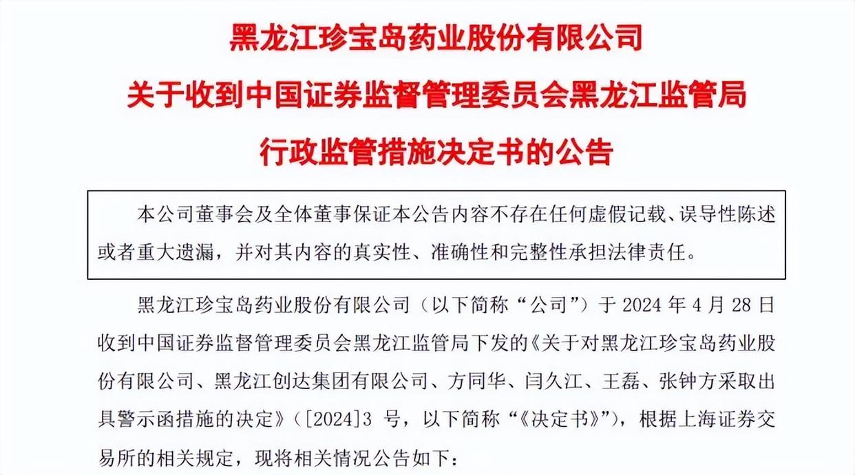 2024年4月,珍宝岛发布公告称,公司收到黑龙江证监局下发的《关于对黑龙江珍宝岛药业股份有限公司、黑龙江创达集团有限公司、方同华、闫久江、王磊、张钟方采取出具警示函措施的决定》。