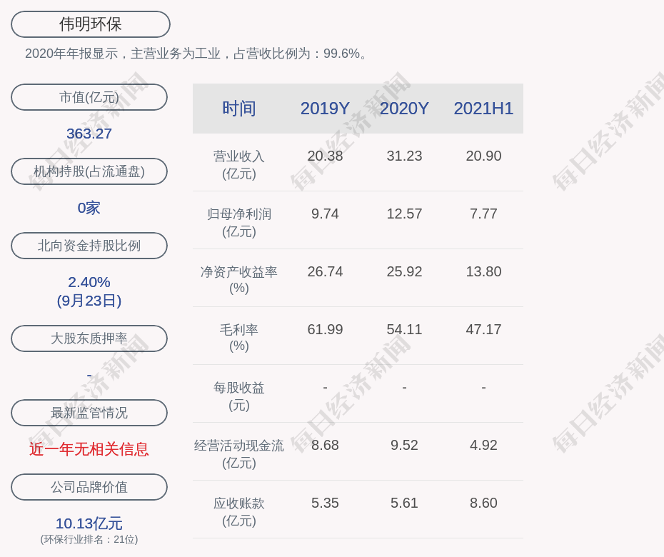 2020年年报显示,伟明环保的主营业务为工业,占营收比例为:99.6%。