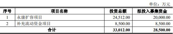 公司10月17日披露的《向不特定对象发行可转换公司债券募集说明书(上会稿)》显示,本次发行可转债拟募集资金不超过人民币2.85亿元(含2.85亿元),扣除发行费用后将全部用于永康扩容项目、补充流动资金项目。