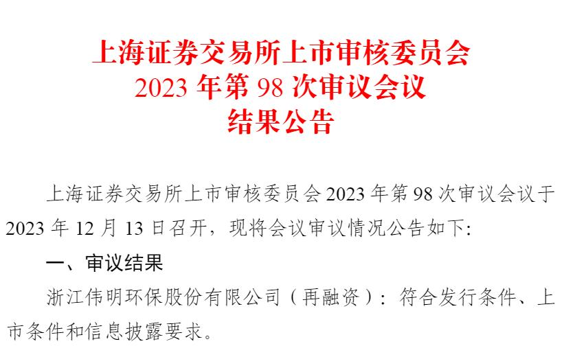 上交所上市审核委员会2023年第98次审议会议于昨日召开,审议结果显示,浙江伟明环保股份有限公司(“伟明环保”,603568.SH)再融资符合发行条件、上市条件和信息披露要求。