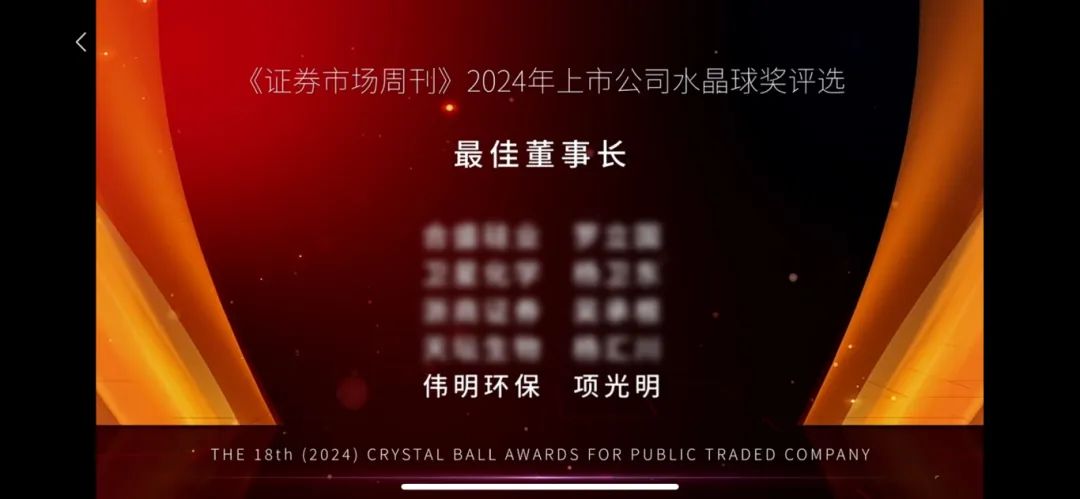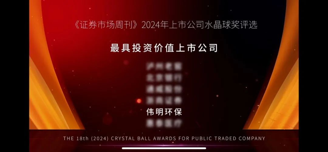 此外,伟明环保还在近期证券市场周刊举办的2024年上市公司水晶球奖评选和证券之星举办的2024年资本力量年度评选中分别荣获“最具投资价值上市公司奖”和“优秀上市公司奖”。