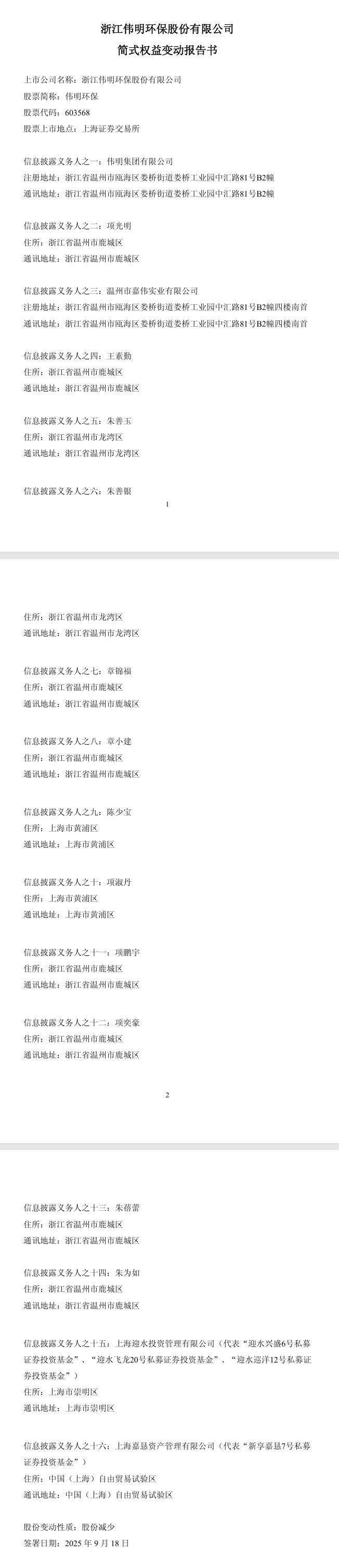 浙江伟明环保股份有限公司(简称:伟明环保)近日发布《简式权益变动报告书》。
