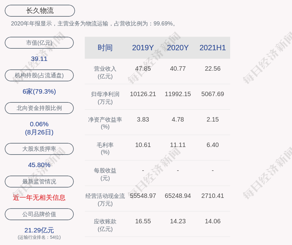 2020年年报显示,长久物流的主营业务为物流运输,占营收比例为:99.69%。