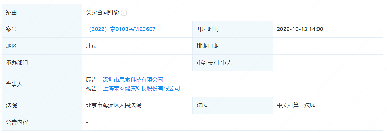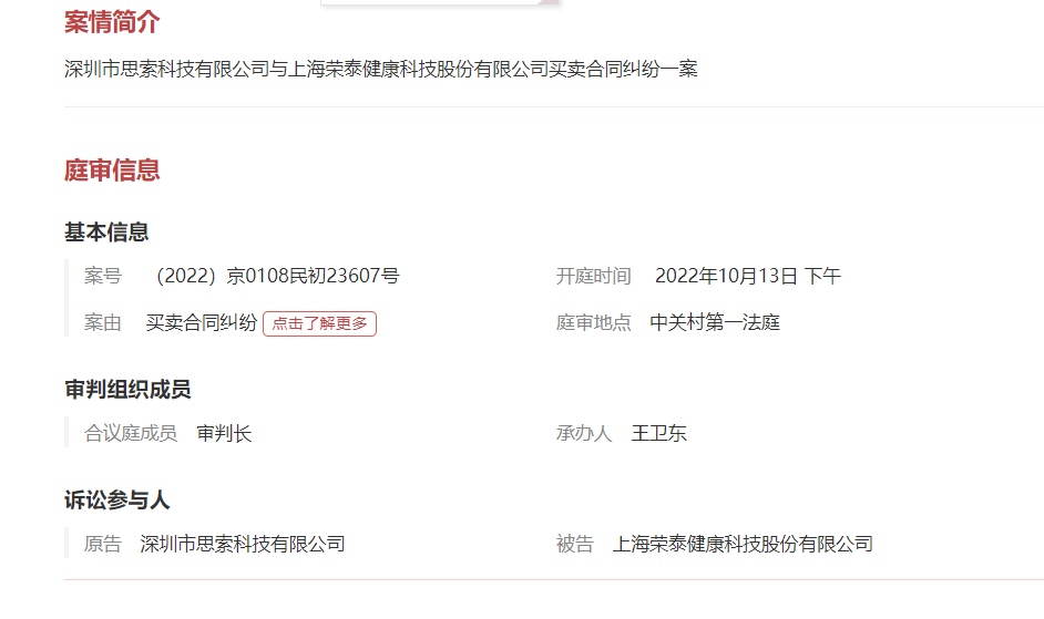 10月13日,上海荣泰健康科技股份有限公司(以下简称“荣泰健康”)新增1则开庭公告,案由系买卖合同纠纷,原告为深圳市思索科技有限公司,被告为荣泰健康。