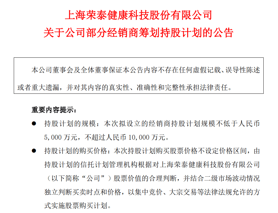 2023年10月28日,荣泰健康发布“关于公司部分经销商筹划持股计划的公告”称,本次拟设立的经销商持股计划规模不低于人民币5000万元,不超过人民币 10000万元,持股计划形式为部分经销商共同设立信托计划,拟计划在本公告披露日起 6个月内完成。