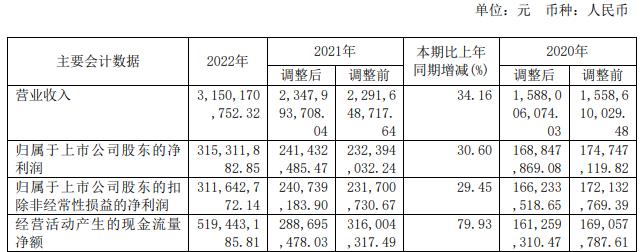 苏利股份2022年年度报告显示,2022年,苏利股份实现营业收入31.50亿元,同比增长34.16%;归属于上市公司股东的净利润3.15亿元,同比增长30.60%;归属于上市公司股东的扣除非经常性损益的净利润3.12亿元,同比增长29.45%;经营活动产生的现金流量净额5.19亿元,同比增长79.93%。
