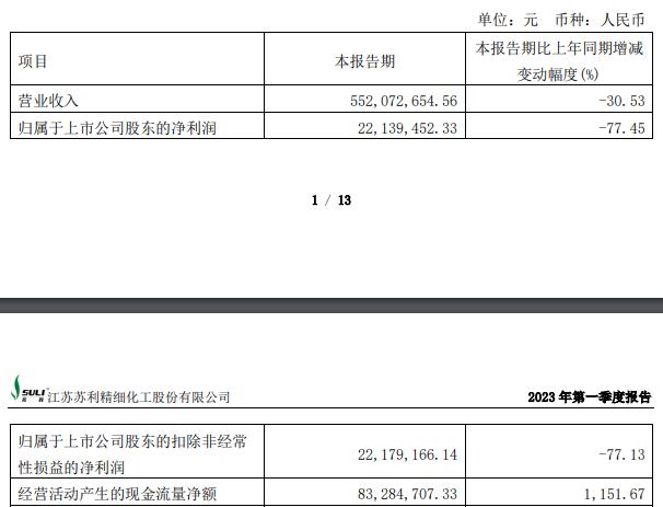 苏利股份2023年第一季度报告显示,2023年一季度,苏利股份实现营业收入5.52亿元,同比下滑30.53%;归属于上市公司股东的净利润2213.95万元,同比下滑77.45%;归属于上市公司股东的扣除非经常性损益的净利润2217.92万元,同比下滑77.13%;经营活动产生的现金流量净额8328.47万元,同比增长1151.67%。