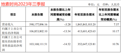 《电鳗财经》注意到,周末时间地素时尚集中披露了三季报、经营数据、实控人增持进展等一系列公告。2023年前三季度,该公司营业收入和净利润分别同比增长7.37%和10.17%,不过三季度单季业绩出现下滑,营业收入和净利润分别下降了3.28%和13.54%。