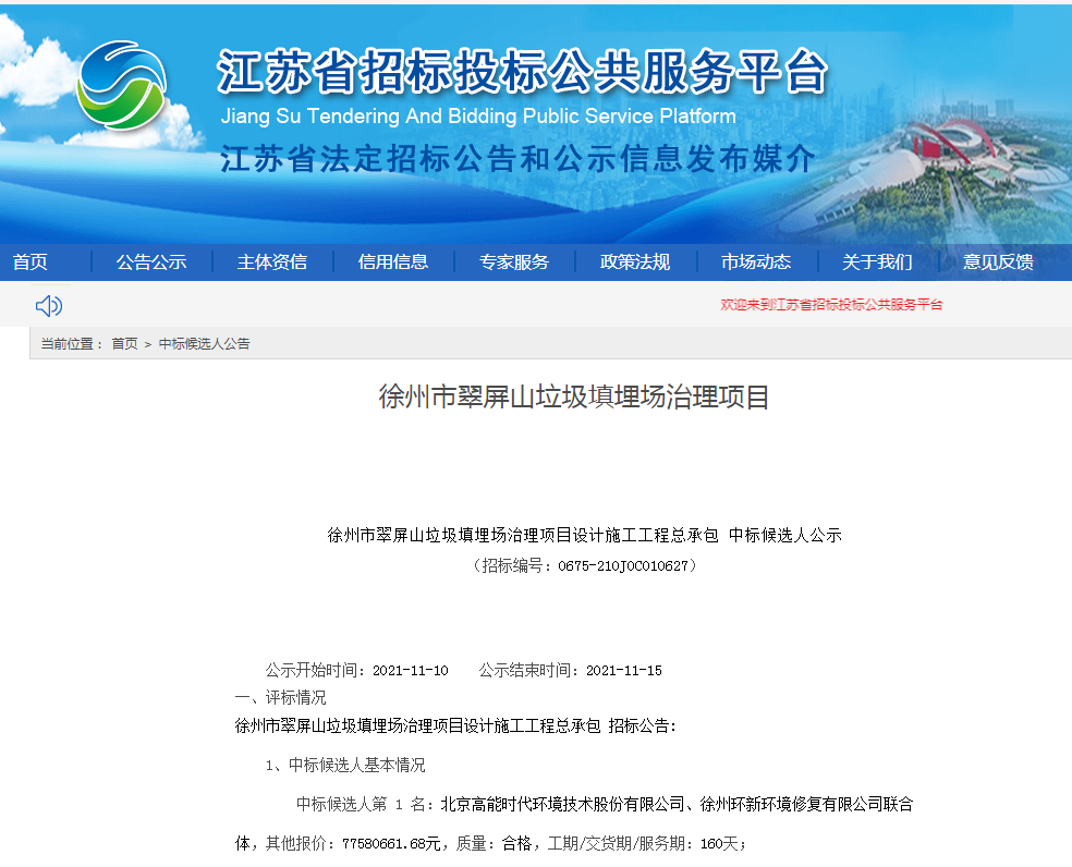 环境商会从企查查获悉,日前,徐州市翠屏山垃圾填埋场治理项目设计施工工程总承包日前发布中标候选人公示,北京高能时代环境技术股份有限公司、徐州环新环境修复有限公司联合体预中标该项目。项目报价77580661.68元,工期/交货期/服务期160天。