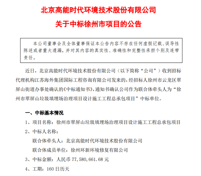 近日,北京高能时代环境技术股份有限公司(下称“高能环境”)联合徐州环新环境修复有限公司,中标徐州市翠屏山垃圾填埋场治理项目设计施工工程总承包项目。中标金额:人民币77,580,661.68元,工期为160天。