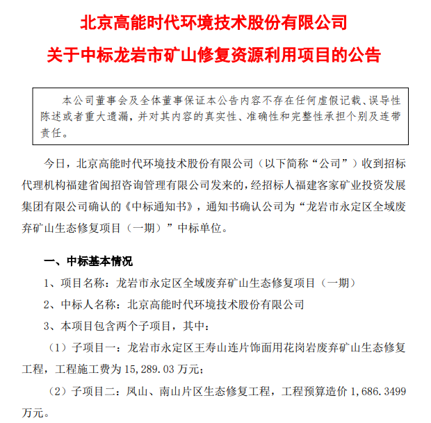 11月29日,高能环境再获喜讯,公司中标了龙岩市永定区全域废弃矿山生态修复项目(一期)。