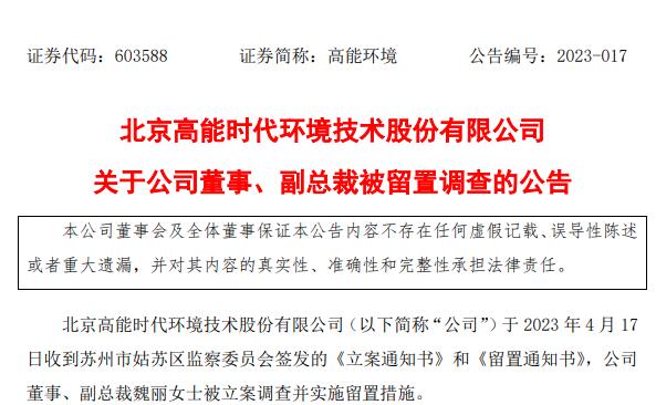 高能环境4月18日晚间公告称,公司于2023年4月17日收到苏州市姑苏区监察委员会签发的《立案通知书》和《留置通知书》,公司董事、副总裁魏丽被立案调查并实施留置措施。