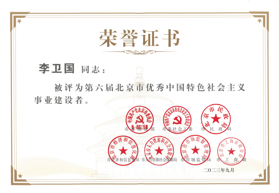 为表彰先进,树立典范,进一步激励广大非公有制经济人士和新的社会阶层人士坚定理想信念、坚持高质量发展,2023年9月8日,第六届北京市非公有制经济人士优秀中国特色社会主义事业建设者表彰大会在北京会议中心隆重举办,北京市委常委、统战部部长杨晋柏出席并讲话,市政协副主席、市工商联主席燕瑛主持会议。会议授予高能环境董事长李卫国等50位非公有制经济人士和新的社会阶层人士“优秀中国特色社会主义事业建设者”荣誉称号。