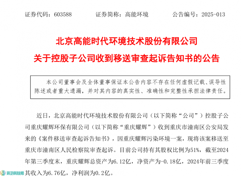 高能环境(证券代码:603588)于3月12日发布公告称,公司控股子公司重庆耀辉环保有限公司(以下简称“重庆耀辉”)收到了重庆市潼南区公安局发来的《案件移送审查起诉告知书》,因重庆耀辉污染环境一案,现将该案移送至重庆市潼南区人民检察院审查起诉。
