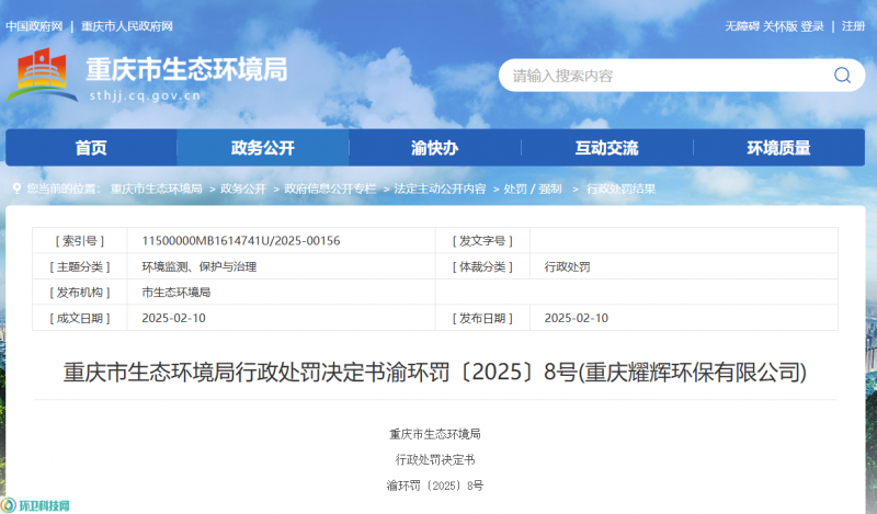 公告显示,重庆耀辉因将未经处理的废水通过雨水管网排入外部环境,构成不正常运行水污染防治设施排放水污染物的环境违法行为,并被重庆市生态环境局作出罚款一百万元的行政处罚。