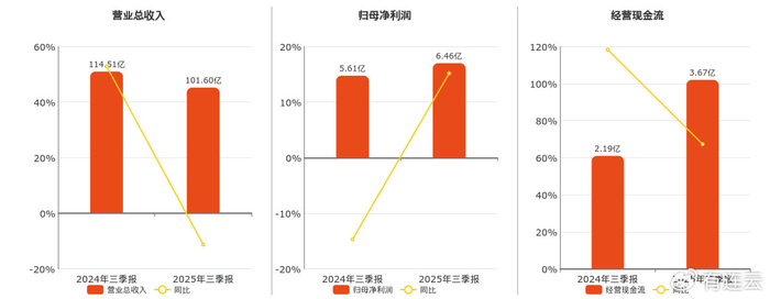 公司营业总收入为101.60亿元,较去年同报告期营业总收入减少12.91亿元,同比较去年同期下降11.28%。归母净利润为6.46亿元。经营活动现金净流入为3.67亿元。