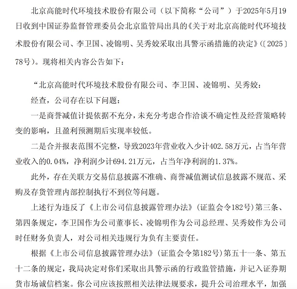瑞财经注意到,2025年5月,高能环境于收到中国证券监督管理委员会北京监管局出具的《关于对北京高能时代环境技术股份有限公司、李卫国、凌锦明、吴秀姣采取出具警示函措施的决定》。