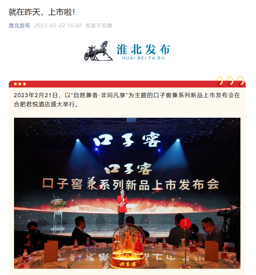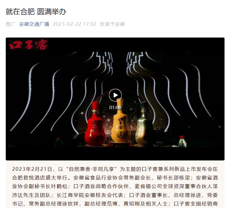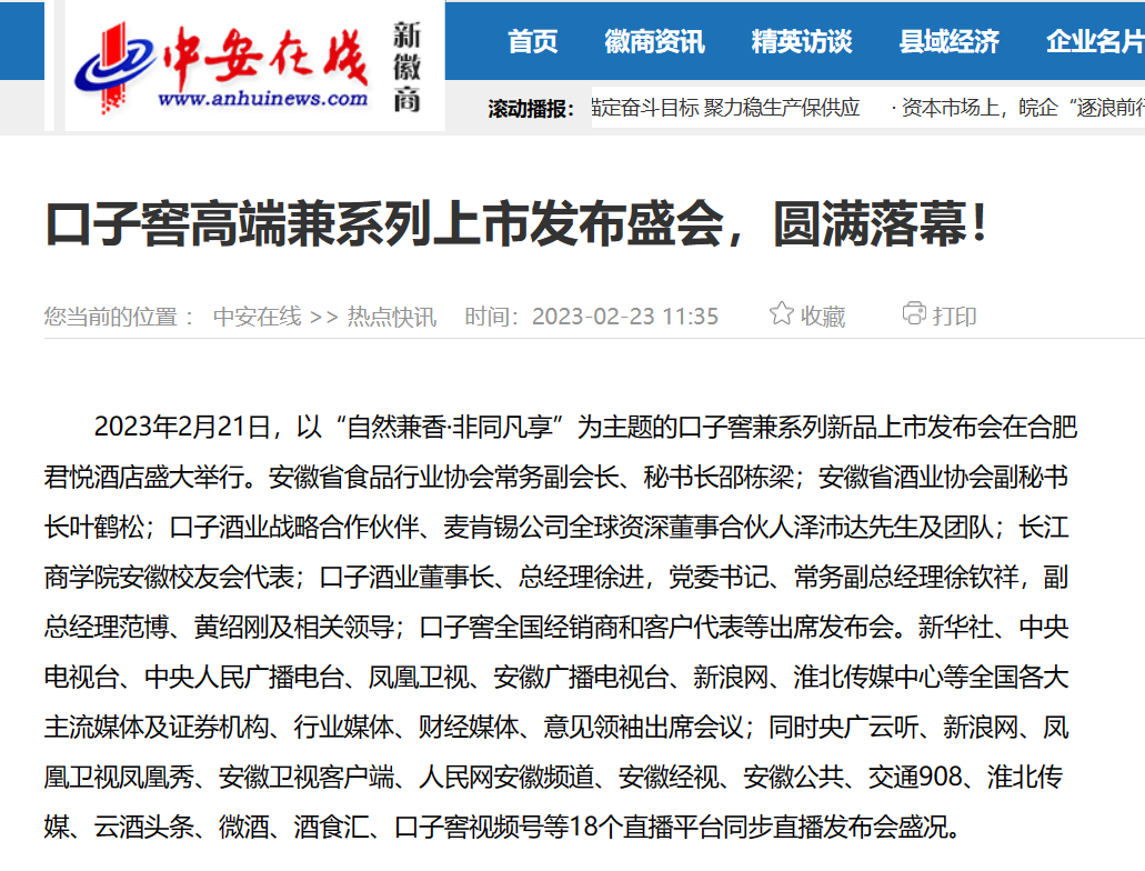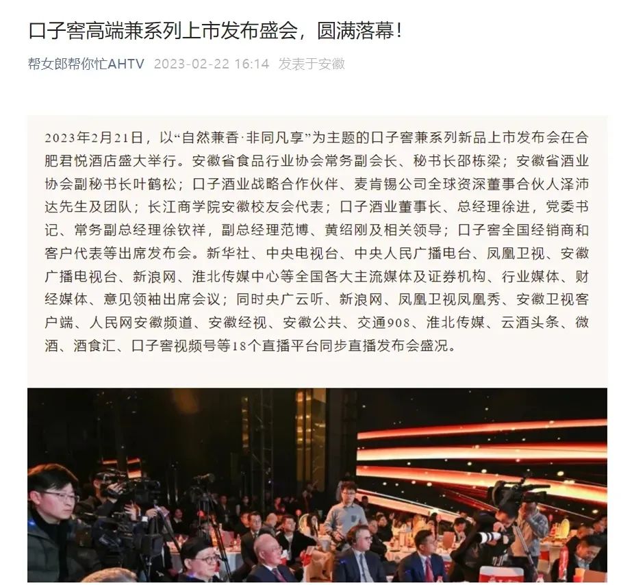 此次口子窖新品发布会引起业界和媒体广泛关注,现场知名媒体百余人亲临现场,共同见证口子窖兼系列新品上市盛大发布。同时发布会开启了媒体线上直播通道,18大平台同步直播,近200万人同时在线观看了会议,共襄盛举。