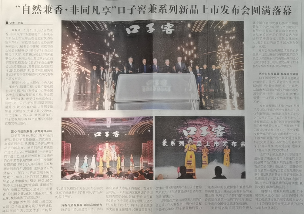 近日,口子窖兼系列新品上市发布会在安徽省合肥市隆重举行。在此次发布会上,口子窖新品兼系列(兼10、兼20、兼30)耀世首发,兼系列产品是口子窖最新推出的次高端、高端系列产品,代表着口子窖品牌与品质的新高度。