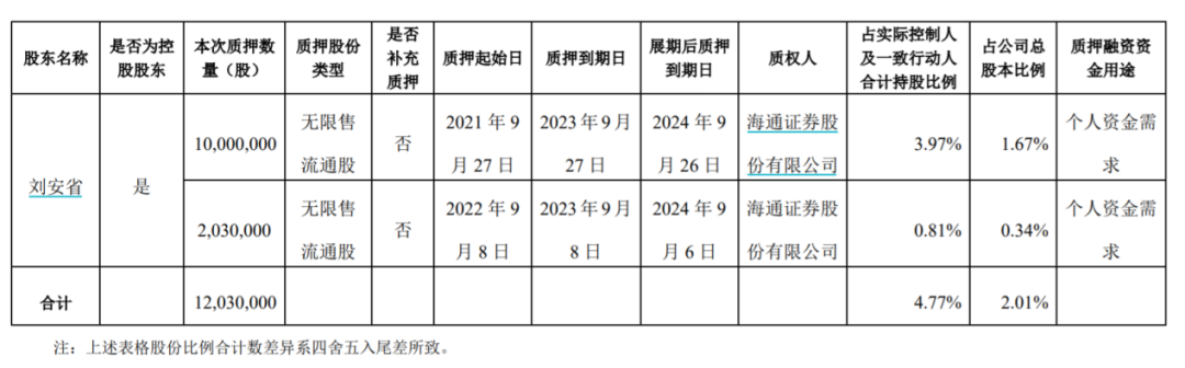 但在2022年9月7日,刘安省将上述股份质押展期一年,展期后的购回交易日为2023年9月27日。到了2023年9月7日,刘安省又将质押展期一年,展期后的购回交易日为2024年9月26日。