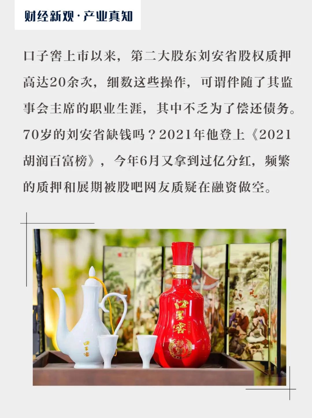 其中提到,刘安省将持有的口子窖的6,090,000股无限售流通股(占公司总股本1.02%)质押给海通证券,用于办理股票质押式回购交易业务,该业务的初始交易日为2023年9月4日,购回交易日为2024年9月3日。用途为偿还债务。