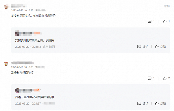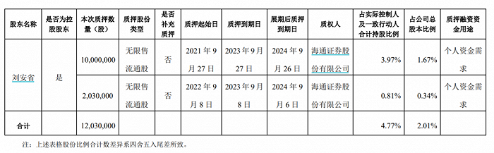 2021年,为了偿还债务,刘安省又向海通证券质押了三次,另因个人资金需求质押一次。2022年,刘安省展期三次,又新增一次质押。